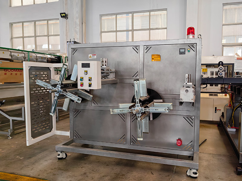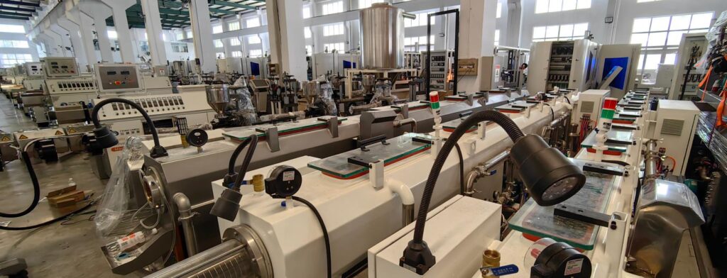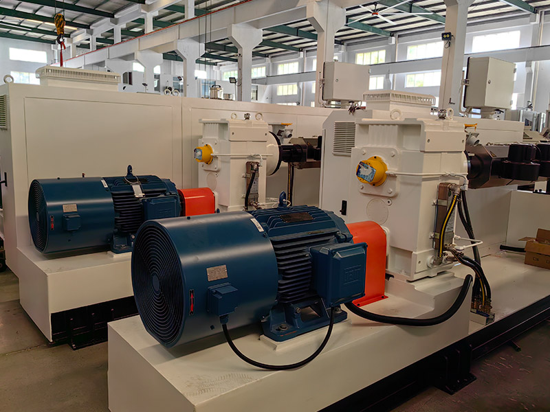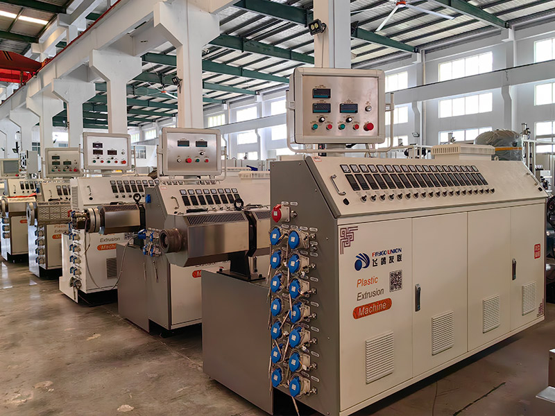 The production line consists of two single-screw extruders, molds, cooling water tanks, traction machines, weaving machines, and winders. The production process is that the extruder squeezes the inner layer, the water tank is cooled, the weaving machine, the extruder squeezes the outer layer, the water tank is cooled, the tractor, and the winder.